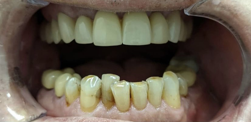 Situation: Our patient had carries on every tooth, and required extractions and multiple restorations with dental crowns.